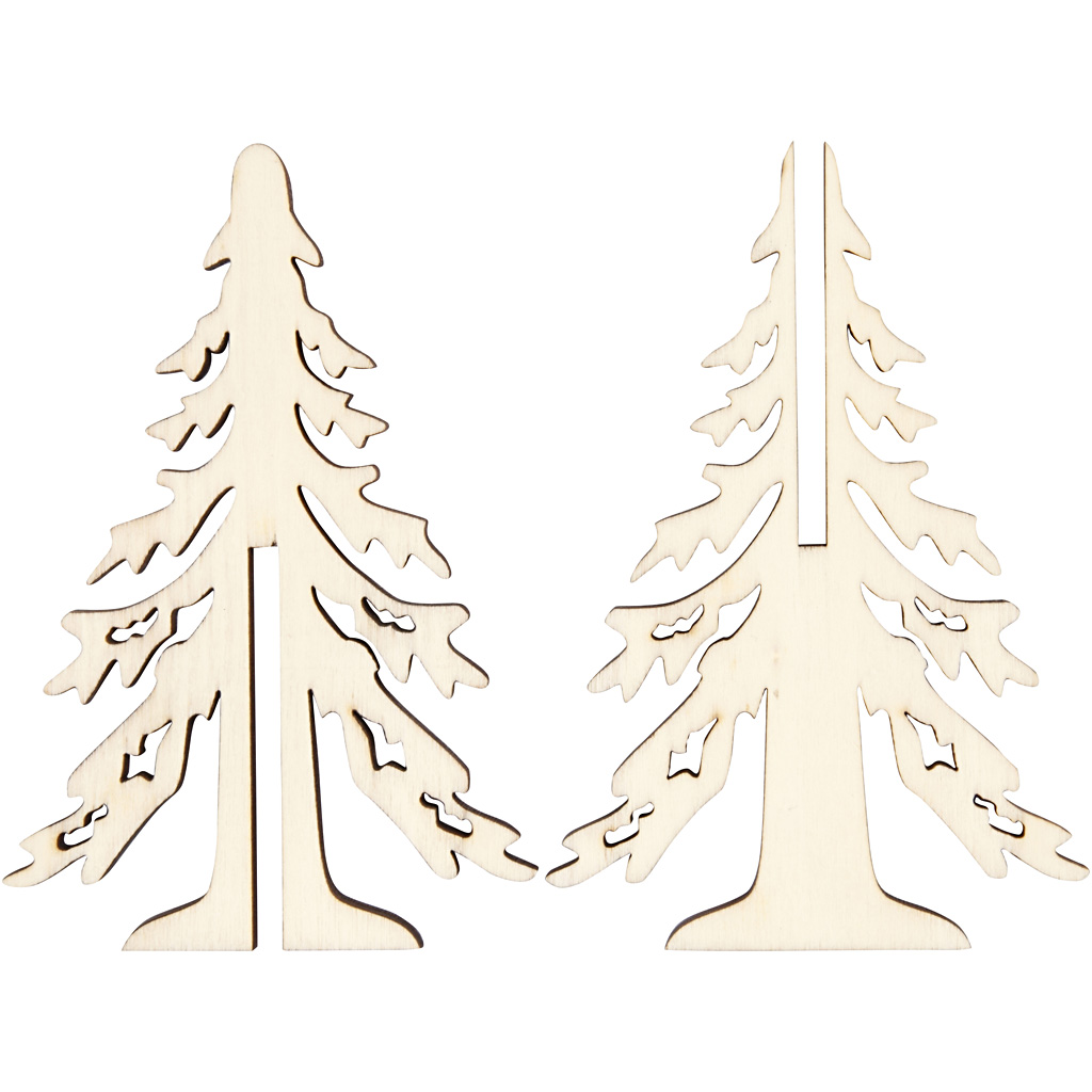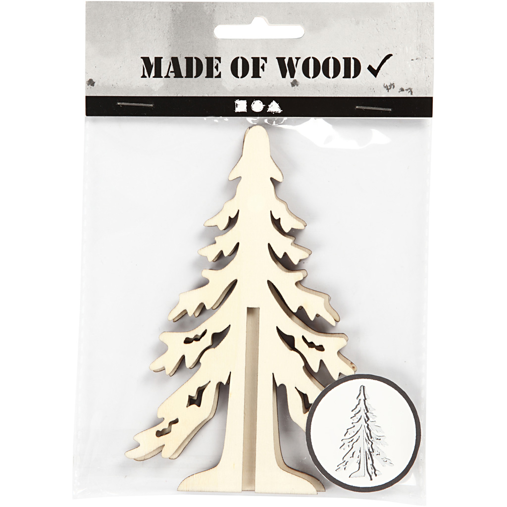 Kerstboom van licht, 3 mm dik hout met donkere randen, bestaande uit de delen met sleuf. De kerstboom heeft een afmeting van 12,5 x 8,5 cm.