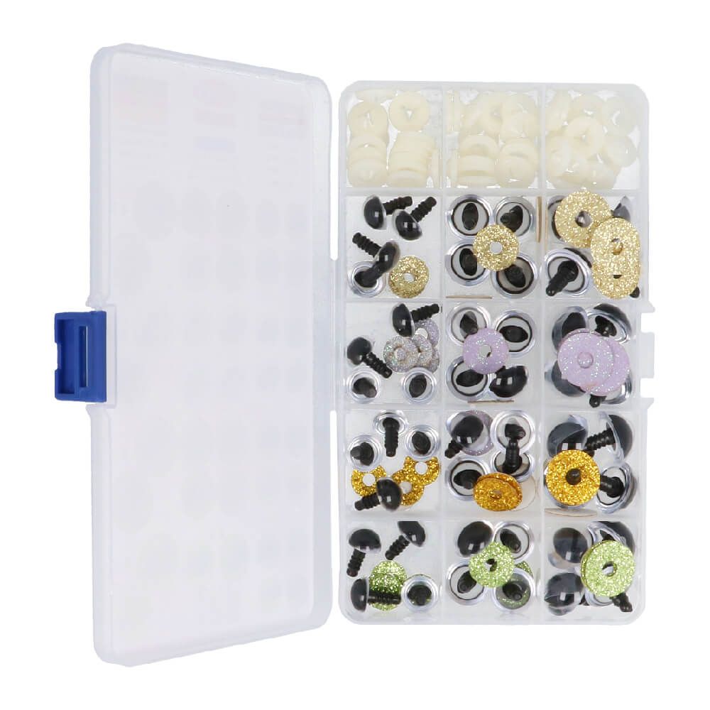Geef zelfgemaakte kattenbeesten, knuffels en amigurumi een eigen karakter met deze sprankelende kattenogen van Opry. De ronde ogen hebben een ellipsvormige, zwarte pupil en een gekleurde iris; achter het oog ligt een glitterschijfje dat het oog zijn vrolijke sprankeling geeft. De veiligheidsogen worden bevestigd door de schroefdraad aan de achterkant door de stof of het breisel te steken en aan de binnenkant met een sluitring vast te zetten. De ogen zijn gemaakt van kunststof en hebben een doorsnee van 12, 15 en 18mm. De ogen worden geleverd in een opbergdoos met 4 verschillende kleuren ogen (groen, paars en licht goud en donker goud) en 4 ogen per afmeting (totaal 48 stuks).